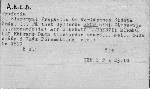 //// Profetia //// 3. Hiercriymi Proph^tia Cm ifierldennes 3idsta Ända, ... På thet Gvllende ABCD uthi Sangewl^s . . . Paromanfattat Aff oTIPfUKC I^UHENTIl MURitEO. »AT HJfBrar.a Cagh tilstundar snart.., it>elt; Gudh stå&r i Gudz Försarrbling, etc,) //// Uo -1697 //// 8 s. 8 ; o //// UUB £ P s 23^10 ////