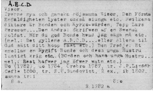 //// V.j 8 or , //// Treme ny a o c h g a nak r. n oj aarama W iscr , P • r. F 5 rata Enfftldigheten lyster oascså slunga etc. rwilkens diktare Ur Bonden och Kyrko-wärden, Tapp Lare .Perscon...Da* Andra: Skrifwen af er Swengk Soldat. Kör du god Bonde hwad jag säga må etc. (rr.el.: Det gyllene A.B.0 ,D.«.. eller Allena til Gud sätt ditt hopp Jaet it c.) Den Tredje; Et emellan er Nygift Bonde och dess unga Hustru . lustigt Krig etc., (BOnäen och hans unga Hustru . . mel.:' Rest hafwer jag öfwcr wath etc.) Uo (1V82} , uo 1/84, CreVro 178.7, tr, J.P.LirMh Gaf le 1800 ¥ tr. F..t;.3ur>d ovist. 2 ex., i V 1802. a*r<va tr; i //// t a. c : o //// ' S 1782 a ////