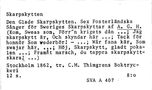 //// Skarpskytten //// Den Glade Skarpskytten, Sex Fosterländska Sånger för Sweriges Skarpskyttar af A. G. H. (Kom, Sweas son, Förren krigets dån Jag //// skarpskytt är, Och skyndar här Tack för //// honnör Som vederbörJ - Wår fana kär, Som //// swajar här, Höj, Skarpskytt, gladt poka- //// len ,Framåt marsch, du tappra skarpskytt-skara.^ t«>) //// Stockholm 1862, tr* C.M. Thimgrens Boktryckeri //// 12 s. 8:0 //// SVA A 407 • ////
