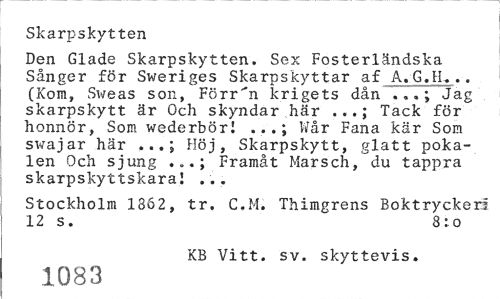 //// Skarpskytten //// Den Glade Skarpskytten. Sex Fosterländska Sånger för Sweriges Skarpskyttar af A. G.EL... (Kom, Sweas son, Förr"n krigets dån .Jag skarpskytt är Och skyndar här ...; Tack för honnör, Som wederbör! ...; Wår Fana kär Som swajar här Höj, Skarpskytt, glatt poka- //// len Och sjung Framåt Marsch,"du tappra //// skarpskyttskara! ... //// Stockholm 1362, tr. C.M. Thimgrens Boktryckeri 12 s. 8:0 //// KB Vitt. sv. skyttevis. //// 1083 ////