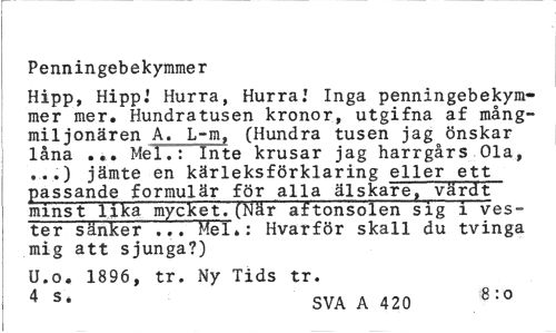 //// Penningebekymmer //// Hipp, HippJ Hurra, Hurra! Inga penningebekymmer mer. Hundratusen kronor, utgifna af mångmiljonären A. L-m, (Hundra tusen jag önskar låna ... Mel.: Inte krusar jag harrgårs Ola, ...) jämte en kärleksförklaring eller ett passande formulär för alla älskare, värdt minst lika mycket.(När aftonsolen sig i ves-ter sänker ... Mel.: Hvarför skall du tvinga mig att sjunga?) //// U.o. 1896, tr. Ny Tids tr. //// 4 s* SVA A 420 8:0 ////