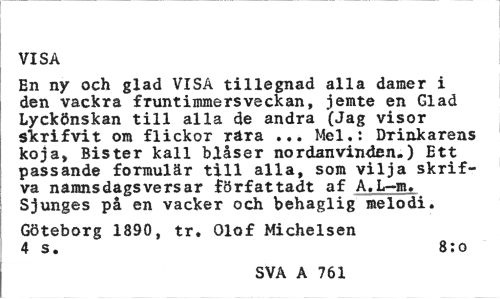//// VISA //// En ny och glad VISA tillegnad alla damer i den vackra fruntimmersveekan, jemte en Glad Lyckönskan till alla de andra (Jag visor skrifvit om flickor rära ... Mel.: Drinkarens koja, Bister kall blåser nordanvinden.) Ett passande formulär till alla, som vilja skrif-va namns dags vers ar författadt af A.L—m. Sjunges på en vacker och behaglig melodi. //// Göteborg 1890, tr. Olof Michelsen 4 s. 8:0 //// SVA A 761 ////