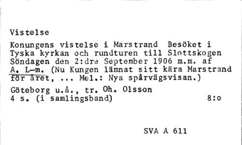 //// Vistelse //// Konungens vistelse i Marstrand Besöket i Tyska kyrkan och rundturen till Slottskogen Söndagen den 2:dra September 1906 m.m. af A. L-m. (Nu Kungen lämnat sitt kära Marstrand för året, ... Mel.: Nya spårvägsvisan.) //// Göteborg u.å., tr. Oh. Olsson 4 s. (i samlingsband) 8:o //// SVA A 6 611 ////