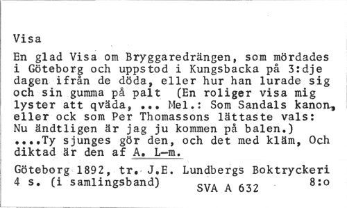 //// Visa //// En glad Visa om Bryggaredrängen, som mördades i Göteborg och uppstod i Kungsbacka på 3:dje dagen ifrån de döda, eller hur han lurade sig och sin gumma på palt (En roliger visa mig lyster att qväda,"... Mel.: Som Sandals kanon, eller ock som Per Thomassons lättaste vals: Nu ändtligen är jag ju kommen på balen.) ...Ty sjunges gör den, och det med kläm, Och diktad är den af A. L-m. //// Göteborg 1892, tr. J.E. Lundbergs Boktryckeri 4 s. (i samlingsband) gy^ A ®:o ////