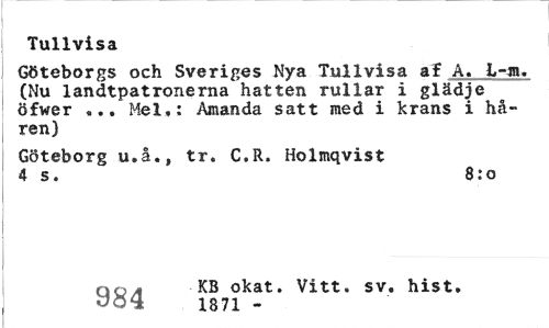 //// Tullvisa //// Göteborgs och Sveriges Nya Tullvisa af A. L-m. (Nu landtpatronerna hatten rullar i glädje öfwer ... Mel,: Amanda satt med i krans i håren) //// Göteborg u.å., tr. C.R. Holmqvist 4 s. 8:0 //// 00* KB okat. Vitt. sv. hist. //// 1871 - ////