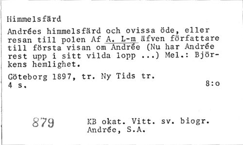 //// Himmelsfärd //// Andrées himmelsfärd och ovissa öde, eller resan till polen Af A. L-m äfven författare till första visan om Andrée (Nu har Andrée rest upp i sitt vilda lopp ...) Mel.: Björkens hemlighet. //// Göteborg 1897, tr. Ny Tids tr. 4 s. 8:0 //// $79 KB °kat. Vitt. sv. biogr. //// Andrée, S.A. ////