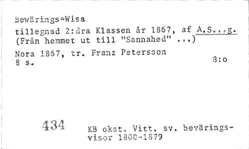 //// 1 Bewärings-Wisa //// tillegnad 2:dra Klassen år 1867, af A.s..»g. (Från hemmet ut till "Sannahed" .,,) //// Nora 186 7, tr, Franz Petersson 8 s* <3:o //// 434 K3 okat» Vitt, sv. bevärings-visor 1800-1879 ////