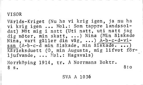 //// VISOR //// Världs-Kriget (Nu ha vi krig igen, ja nu ha vi krig igen ... Mel.: Som tappre landssoldat) Möt mig i natt (Uti natt, uti natt jag dig möter, min s 1c 3. t ^ « • Nina (Min älskade Nina, vart gäller din väg, ...) A-b-c-d-vi-san (A-b-c-d min älskade, min älskade. ...) Kärleksduett (0, min Augusta, mig lifvet för-ljufvande, ... Mel.: Hagavals) //// Norrköping 1914, tr. A Norrmans Boktr. 8 s. * 8:o //// SVA A 10 36 ////