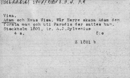 //// ycjl WJMJIV i-Hl'/ i .' 7 - -VV5X1- o » i" » sr, Utvisa. //// Adam och Eva» Wisa. 'får Herre skapa Adam den första man och uti Paradis der sattes ha". Stockholm l801, tr. A.J.Sylvenius //// 4 s . 8: o //// Z 1801 b //// ' -i . .. . v ; : : . . ////