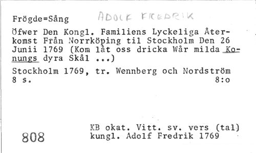 //// Frögde=Sång //// öfwer Den Kongl. Familiens Lyckeliga Återkomst Från Norrköping til Stockholm Den 26 Junii 1769 (Kom lat oss dricka V/år milda Konungs dyra Skål ...) //// Stockholm 1769, tr. Wennberg och Nordström 8 s. 8:o //// Q1 Q KB okat. Vitt. sv. vers (tal) //// 0 kungl, Adolf Fredrik 1769 ////