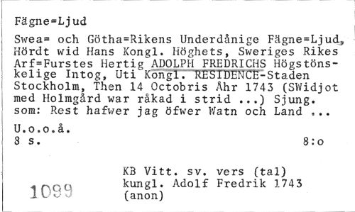 //// Fägne=Ljud //// Swea= och Götha=Rikens Underdånige Fägne^jud, Hördt wid Hans Kongl. Höghets, Sweriges Rikes Arf=Furstes Hertig ADOLPH FREPRICHS Högstöns-kelige Intog, Uti Korigi. Ri:S i DUN Staden Stockholm, Then 14 Octobris Åhr 1743 (SWidjot med Holmgård war råkad i strid ...) Sjung, som: Rest hafwer jag öfwer Watn och Land ... //// U.o.o.å. //// 3 s. 8: o //// KB Vitt. sv. vers (tal) //// 4nnf, kungl. Adolf Fredrik 1743 //// jH' (anon) ////