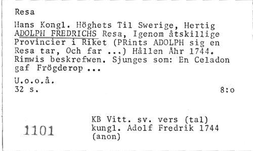 //// Resa //// Hans Kongl. Höghets Til Swerige, Hertig ADOLPH FREDRICH5 Resa, Igenom åtskillige Provincier i Riket (PRints ADOLPH sig en Resa tar, Och far ...) Hållen Åhr 1744, Rimwis beskrefwen. Sjunges som: En Celadon gaf Frögderop ... //// U. o. o. å. //// 32 s. 8:0 //// KB Vitt. sv. vers (tal) //// 11 ni kungl. Adolf Fredrik 1744 //// JJUJ- (anon) ////