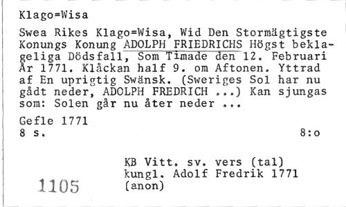 //// Klago=Wisa //// Swea Rikes Klago=Wisa, Wid Den Stormägtigste Konungs Konung ADOLPH FRIEDRICHS Högst bekla-geliga Dödsfall, Som Timade den 12. Februari Är 1771. Klåckan half 9. om Aftonen. Yttrad af En uprigtig Swänsk. (Sweriges Sol har nu gådt neder,' ADOLPH FREDRICH ...) Kan sjungas som: Solen går nu åter neder ... //// Gefle 1771 //// 8 s. 8:o //// KB Vitt. sv. vers (tal) //// kungl. Adolf Fredrik 1771 //// 1105 (^on) ////