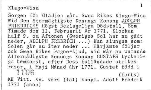 //// Klago=Wisa 1 //// Sorgen för Glädjen går. Swea Rikes Klago=Wisa Wid Den Storraägtigste Konungs Konung ADOLPH FRIEDRICHS Högst Beklageliga Dödsfall, Som Timade den 12. Februarii Ar 1771. Klockan half 9. om Aftonen (Sweriges Sol har nu gådt neder, ADOLPH FREDRICH ...) Kan siungas som: Solen går nu åter neder ... Härjämte följer ock Swea Rikes Fägne=Ljud, Wid wår nu warande Allernådigste Konungs Konung GUSTAFS Lyckeliga hemkomst, efter Dess fulländade utrikes resor, i Maj i Månad åhr 1771. Gustaf född i //// 1108 (forts) //// ICB Vitt. sv. vers (tal) kungl. Adolf Fredrik 17 71 (anon) ////