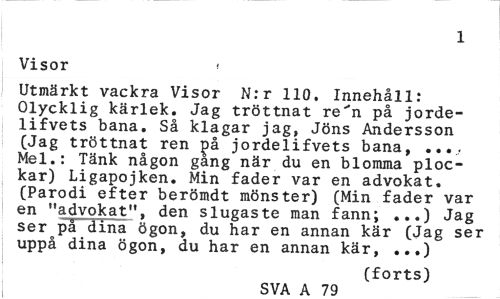//// 1 //// Visor ! //// Utmärkt vackra Visor N:r 110. Innehåll: Olycklig kärlek. Jag tröttnat re^n på jordelifvets bana. Så klagar jag, Jöns Andersson (Jag tröttnat ren på jordelifvets bana, ... Mel.: Tänk någon gang när du en blomma plockar) Ligapojken. Min fader var en advokat. (Parodi efter berömdt mönster) (Min fader var en "advokat", den slugaste man fann; ...) Jag ser på dina ögon, du har en annan kär (Jag ser uppå dina ögon, du har en annan kär, ...) //// (forts) //// SVA A 7Q ////