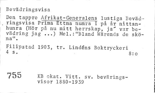 //// Bevädringsvisa //// Den tappre Afrikat-Generalens lustiga Bevädringsvisa Prima Ettma numra I på år nittan-hunra (Hör på nu mitt herrskap, ja-' var be-vädring jag ...) Mel.:"Bland Wärends de sköna". //// Filipstad 1903, tr. Lindens Boktryckeri 4 s. ' 8:0 //// 755 KB okat. Vitt, sv. bevärings-visor 1880-1939 ////