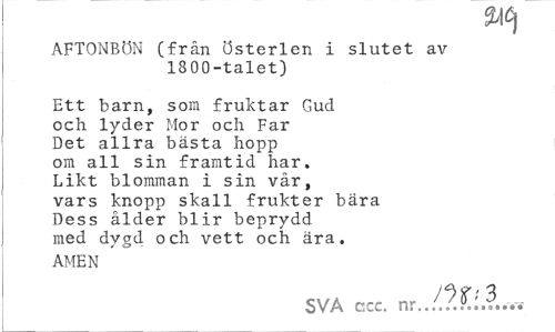 //// SMCj //// AFTONBÖN (från Österlen i slutet av 1300-talet) //// Ett barn, som fruktar Gud och lyder Mor och Far Det allra bästa hopp om all sin framtid har. Likt blomman i sin vår, vars knopp skall frukter bära Dess ålder blir beprydd med dygd och vett och ära. //// AMEN //// SVA cscc. nr.. ////