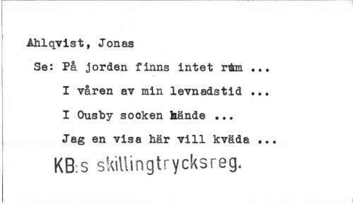 //// Ahlqvist, Jonas Se: På jorden finns intet riiim ... I våren av min levnadstid ... I Ousby socken hände ... Jag en visa här vill kväda ... //// KB.s skillingtrycksreg. ////