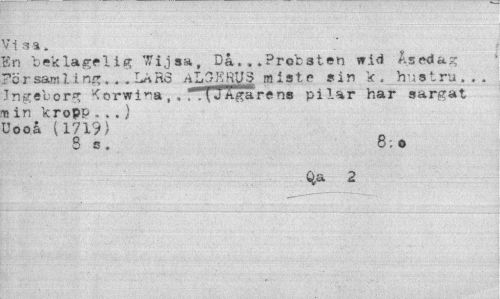 //// Visa» //// En beklagelig T ijsa, D&.. .Probsteti w.t<l Ås cd a ^ Församling. . .LA R3 aL^ERUS mistp »in k. hustru... Ingeborg Korwi^a, » r". i J Ägare na pilar har sargat b in kropp . . . ) öooå (1719) //// 8 s . 8: o //// Qa 2 ////