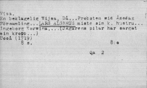 //// / Isa. . ¦ //// Sn beklägel ig Wijsa, Da.. .Probstefl wid Asedag ?örsarol.tng. . . LAES AL3KRU3 miste sin k. hustru... Ingeberg Korwina,. . jagarens pilar har sargat s in kropp . . .) Jooa (1719) //// 8 s. 8; o //// Qa 2 ////