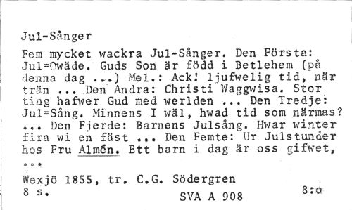 //// Jul-Sånger //// Fem mycket '.vackra Jul-Sånger. Den Första: Jul=Owäde. Guds Son är född i Betlehem (på denna dag .».) Mel.: Ack.' ljufwelig tid, när trän ... Den Andra: Christi Waggwisa. Stor ting hafwer Gud med werlden ... Den Tredje: Jul=Sång. Minnens I wäl, hwad tid som närmas? »„. Den Fjerde: Barnens Julsång. Hwar winter fira wi en fäst ... Den Femte: Ur Julstunder hos Fru Almen. Ett barn i dag är oss gifwet, //// o o • //// Wexjö 1855, tr. C.G. Södergren 8 s* SVA A 908 8:0 ////