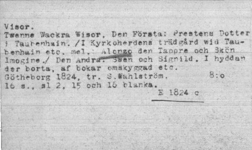 //// Visor. //// Twenne Wackra Wisor, Den Första: *>restena Dotter i Taubenhain. /I Kyrkoherdens trädgård ve i d ?au-henhai" etc, mel,: \ cfilffi den la o pre och 3kcn Imoglne./ Den andrrf*.1 och Signild. I hyddan //// dier borta, af bokar emsky^ad etc. döthfborg 1824, tr. 6.Kanlatrem. 8:0 //// 15 s., si 2, 15 och 16 blinka. //// E 1Ö24 c ////