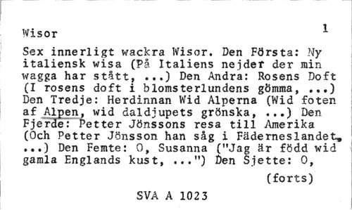 //// Wisor 1 //// Sex innerligt wackra Wisor. Den Första: Ny italiensk wisa (På Italiens nejder der min wagga har stått, ...) Den Andra: Rosens Doft (I rosens doft i blomsterlundens gömma, ...) Den Tredje: Herdinnan Wid Alperna (Wid foten af Alpen, wid daldjupets grönska, ...) Den Fjerde: Petter Jönssons resa till Amerika (Och Petter Jönsson han såg i Fäderneslandet, ...) Den Femte: 0, Susanna ("Jag är född wid gamla Englands kust, ...") Den Sjette: 0, //// (forts) //// SVA A 1023 ////