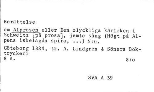 //// Berättelse //// om Alprosen eller Den olyckliga kärleken i Schweitz [på prosa], jemte sång (Högt på Alpens isbelagda spira, ...) N:6. //// Göteborg 1884, tr. A. Lindgren & Söners Boktryckeri //// 8 s. 8:0 //// SVA A 39 ////