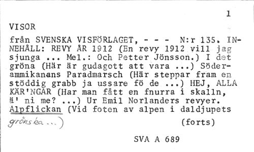 //// 1 //// VISOR //// från SVENSKA VISFÖRLAGET, --- N:r 135» INNEHÅLL: REVY ÅR 1912 (En revy 1912 vill jag sjunga ... Mel.: Och Petter Jönsson.) I det gröna (Här är gudagott att vara ...) Söder-ammikanans Paradmarsch (Här steppar fram en stöddig grabb ja ussare fö de ...) HEJ, ALLA KÄR'NGAR (Har man fått en fnurra i skalln, ä1 ni me? »..) Ur Emil Norlanders revyer. Alpflickan (Vid foten av alpen i daldjupets //// grotis <k . <,( fo rts ) //// SVA A 689 ////