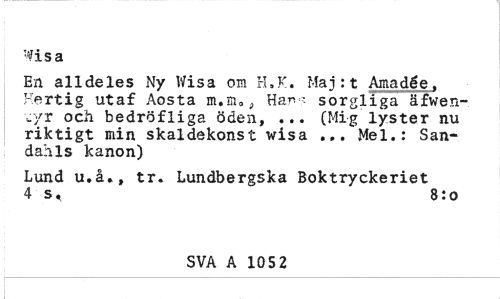 //// Wisa //// En alldeles Ny Wisa om H.K. Maj:t Amadée, Hertig utaf Aosta m,ma, Har- sorgliga äfwen-cyr och bedröfliga öden, ... (Mig lyster nu riktigt min skaldekonst wisa ... Mel.: Sandahls kanon) //// Lund u.å», tr. Lundbergska Boktryckeriet 4 s, 8:0 //// SVA A 105 2 ////