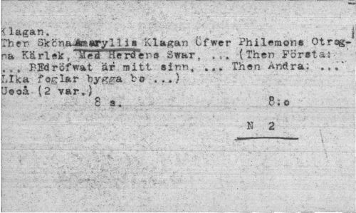 //// (lagan. //// Then Skena-Amaryllis Klagan Cfwer Philemone Otrogna Kärlek, Med Herden» Svar, (Then Företa: . .. PEdröfwat är aitt sinn, ... Then Andra: ..." Lika fog lar bjr^ga bo . ..) LJooå (2 var.) //// 8 s. 8; o //// N 2 ////