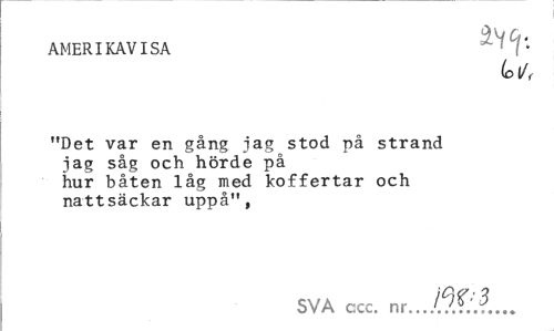 //// AMERIKAVISA //// (o\J< //// "Det var en gång jag stod på strand iag såg och hörde på hur båten låg med koffertar och nattsäckar uppå", //// SVA ccc. nr... ////