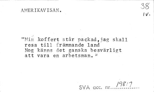 //// Q //// AMERIKAVISAN. //// /l/> //// "Min koffert står packad,iag skall resa till främmande land Nog känns det ganska besvärligt att vara en arbetsman. //// SVA ccc. nr... ////