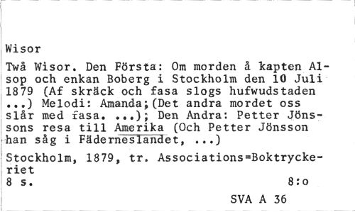 //// Wisor //// Twå Wisor. Den Första: Om morden å kapten Al-sop och enkan Boberg i Stockholm den 10 Juli 1879 (Af skräck och fasa slogs hufwudstaden ...) Melodi: Amandaj(Det andra mordet oss slår med fasa. ...); Den Andra: Petter Jönssons resa till Amerika (Och Petter Jönsson han såg i Fäderneslandet, ...) //// Stockholm, 1879, tr. Associations=Boktrycke-riet //// 8 s. 8:o //// SVA A 12 7 ////