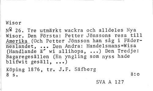 //// Wisor //// N- 26. Tre utmärkt wackra och alldeles Nya Wisor. Den Första: Petter Jönssons resa till Amerika (Och Petter Jönsson han såg i Fäderneslandet, ... Den Andra: Handelsmans=Wisa (Handlande ä" wi allihopa, ...) Den Tredje: Bagaregesällen (En yngling som nyss hade blifwit gesäll, ...) //// Köping 1876, tr. J.F. Säfberg 8 s. 8: o //// SVA A 12 7 ////