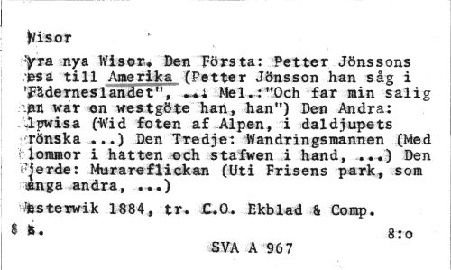 //// ftisor //// "yra nya Wisor,» Den Första: Petter Jönssons psä till Amerika (Petter Jönsson han såg i 'Fäderneslandet'1, •«; Mel.:"Och far min salig .jan war en westgöte han, han") Den Andra: -Ipwisa (-Wid foten af Alpen, i daldjupets //// rönska . ..) Den Tredjei Wandringsmannen (Med liommor i hatten och stafwen i hand, ...) Den Pierde: Murareflickan (Uti Frisens park, som ånga andra , ...) //// fcsterwik 1884, tr. C.O. Ekblad & Comp. //// SS. 8:0 //// SVA A 967 ////