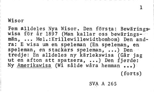 //// 1 //// Wisor //// Fem alldeles Nya Wisor. Den första: Bewärings-wisa för år 1897 (Man kallar oss bewärings-män, ... Mel.:Krillewillewidtbombom) Den andra: E wisa um en speleman (En speleman, en speleman, en stackars speleman, ...) Den tredje: En alldeles ny kärlekswisa (Går jag ut en afton att spatsera, ...) Den fjerde: Ny Amerikawjsa (Wi sålde wåra hemman ...) //// (forts) //// SVA A 265 //// I • '' ' ////