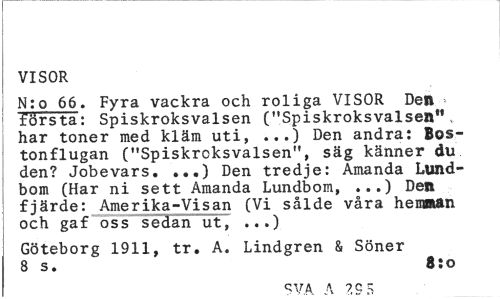 //// VISOR //// N:o 66. Fyra vackra och roliga VISOR Den -• första: Spiskroksvalsen ("Spiskroksvalsen". har toner med kläm uti, ...) Den andra: Bos-tonflugan ("Spiskroksvalsen", säg känner du den? Jobevars. ...) Den tredje: Amanda Lundbom (Har ni sett Amanda Lundbom, ...) Den fjärde: Amerika-Visan (Vi sålde våra hemman och gaf oss sedan ut, ...) //// Göteborg 1911, tr. A. Lindgren & Söner 8 s. 8:o //// 5VA \ ?Cs ////