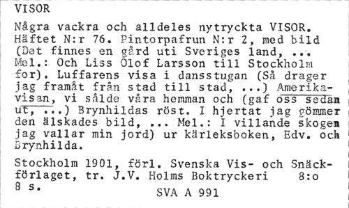 //// VISOR //// Några vackra och alldeles nytryckta VISOR. Häftet N:r 76. Pintorpafrun N:r 2, med bild (Det finnes en gård uti Sveriges land, ... Mel.: Och Liss Olof Larsson till Stockholm for). Luffarens visa i dansstugan (Så drager jag framåt från stad till stad, ...) Amerikavisan, vi sålde våra hemman och (gaf oss sedan ut, ...) Brynhildas röst. I hjertat jag gömmer den älskades bild, ... Mel.: I villande skogen jag vallar min jord) ur kärleksboken, Edv. och Brynhilda. //// Stockholm 1901, förl. Svenska Vis- och Snäck-förlaget, tr. J.V. Holms Boktryckeri 8:o //// 8 s> SVA A 991 ////