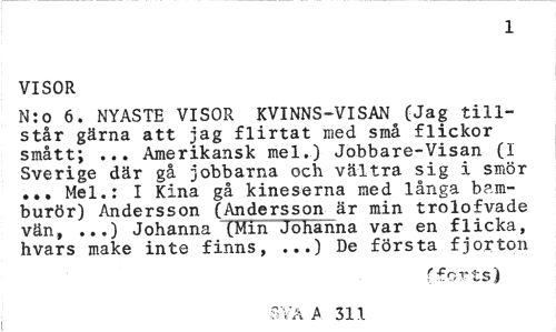 //// 1 //// VISOR //// N:o 6. NYASTE VISOR KVINNS-VISAN (Jag tillstår gärna att jag flirtat med små flickor smått; ... Amerikansk mel.) Jobbare-Visan (I Sverige där gå jobbarna och vältra sig i smör ... Mel.: I Kina gå kineserna med långa bamburör) Andersson (Andersson är min trolofvade vän, ...) Johanna (Min Johanna var en flicka, hvars make inte finns, ...) De första fjorton //// ( -C Q x t //// Sva A 311 ////