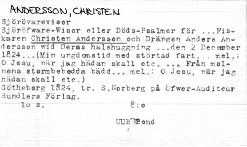 //// frWbefcSSOK), CK^JL^TE-W //// Sj örövarevi sor //// Sj öröfware-Wisor eller Döds-Psalmer för ...Fiskaren Christ_en Andersson och Drängen noders? Andersson wid Deras halshuggning ..»den 2 DeorOfber 1824 ... (.Min ungdomstid med störtad fart,., mel.; 0 Jesu, när jag hädan skall etc. ... Från molnens ftormhebodda bädd... mel,.' 0 Jesu, när jag hädan skall etc.) //// Götheborg 1824, tr. S.Norberg på Cfwer-Auditeur Sundlers Förlag. //// lo s, 8;o //// UUE~®ond //// i ////