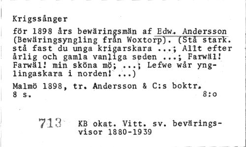 //// Krigssånger //// för 1898 års bewäringsmän af Edw.. Andersson (Bewäringsyngling från Woxtorp). (Stå stark, stå fast du unga krigarskara ...; Allt efter årlig och gamla vanliga seden . . FarwälJ Farwäli min sköna mö; Lefwe wår yng- //// lingaskara i norden! ...) //// Malmö 1898, tr. Andersson & C:s boktr. 8 s. 8:o //// 713 KB okat. Vitt. sv. bevärings-visor 1880-1939 ////