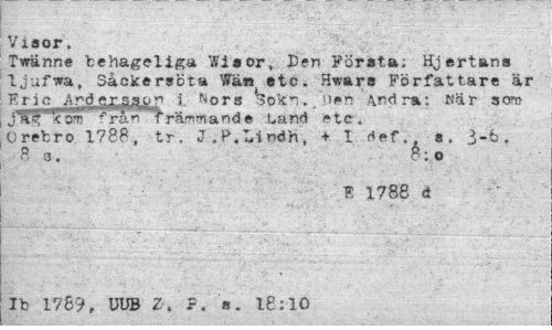 //// Visor. //// Twänne behageliga Wisor, Den Första; Hjertans //// ljufwa, Såclcersöta Wä« etc. Hwars Författare är //// Eric Ardei^gop i. Nors ^okn, u^n Andra: När so» //// jiflj'"'*om frän ' främmande Land etc. //// Ore1r.ro 1788, tr. J.P.Lindh, + 1 def s. 3-6. 83. 8:0 //// E 1788 d //// Ib 1769, UDB Z. P. «. 18:10 ////