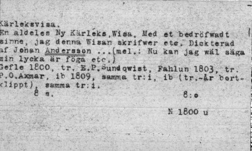 //// Lärlek sv i sa. _ , //// 5m aldeles Ny Karleks,Wisa, Med et bedrcfwadt ' sinne, jag denna Wisan skrifwer et©. Dickterad if Joban Andersson ...(mel.; Nu kan jag wal säga sin lycka är Foga etc.) //// Jefle lECO, tr. E.P.äundqwist, Fahlun 1803, tr. '.O.Axaiar, ib 1809, samma tr:i, ib (tr.-ir bort-rlippt) samma tr;i. //// c s. 8; o //// K 18OO u ////