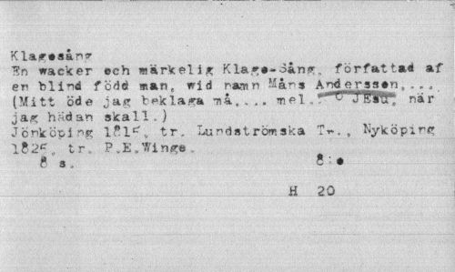 //// Kiagssån?»' //// En waeker ech warkelig Klag«~3ånw„ författa* af en blind född nan, wid ramn Mars Andersseri, . . . //// (Mitt öd« jag beklaga Tia,... tipI, 1 "J"BlCt"; nar //// ja/»: had an skall . ) //// Jönköping ifl^» tr. Lundströmska , Nyköping //// 182*. tr, P.E.Winge //// 8 s 8 • //// H 20 ////