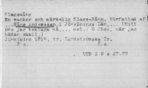 //// Klagosång //// Ert waeker och märk;el ig Klago-Sång, Författad af . . J/ån^ And eiesson. i Jönköpings Län, . , . (Mitt cd e ja/? "fc ekTu7*a må,,,, mel.: O JK au, rar jag hädar skall.) //// Jönköping lPlc , tr, Lurd st rom ska Tr» P 3. C; o //// UUE Z P e 27,77 ////
