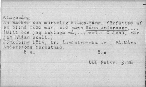 //// Klag osång //// 35n waeker och märkelag Ki.ago-3ång\ författad af en blind fcdd mar, wid namn M å n 3, And er s a o n. .. „ (Mitt 'ode jag beklaga må, . . .".mel .t C .i esu, när j a g hädan skall.} //// Jönköping tr. Lund-strömska Tr, , Pi«Kån& //// Anderssons bekostnad, //// 8 fi. 8. o //// UUE Pol k. v , 3 26 ////