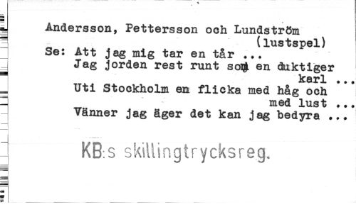 //// y Andersson, Pettersson och Lundström I (lustspel) //// Se: Att jag mig tar en tår ... //// Jag jorden rest runt soi| en duktiger //// * karl .., Uti Stockholm en flicka med håg och //// * med lust .. Vänner jag äger det kan jag bedyra ... //// I KB:S skill i n g t r y eks reg. ////