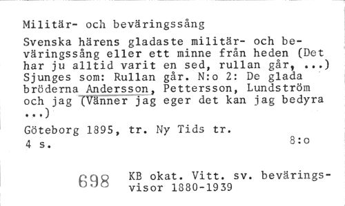 //// Militär- och beväringssång //// Svenska härens gladaste militär- och beväringssång eller ett minne från heden (Det har ju alltid varit en sed, rullan går, ...) Sjunges som: Rullan går. N:o 2: De glada bröderna Andersson, Pettersson, Lundström och jag (Vänner jag eger det kan jag bedyra //// Göteborg 1895, tr. Ny Tids tr. 4 s. 8:o //// pqn KB okat. Vitt. sv. bevärings-0,J0 visor 1880-1939 ////