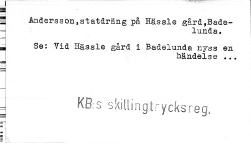//// J //// j Andersson,statdräng på Hässle gård,Badelund a. //// ^ Se: Tid Hässle gård i Badelunda ny3s en //// händelse ... //// KB.s skillingtrycksreg, //// B ////